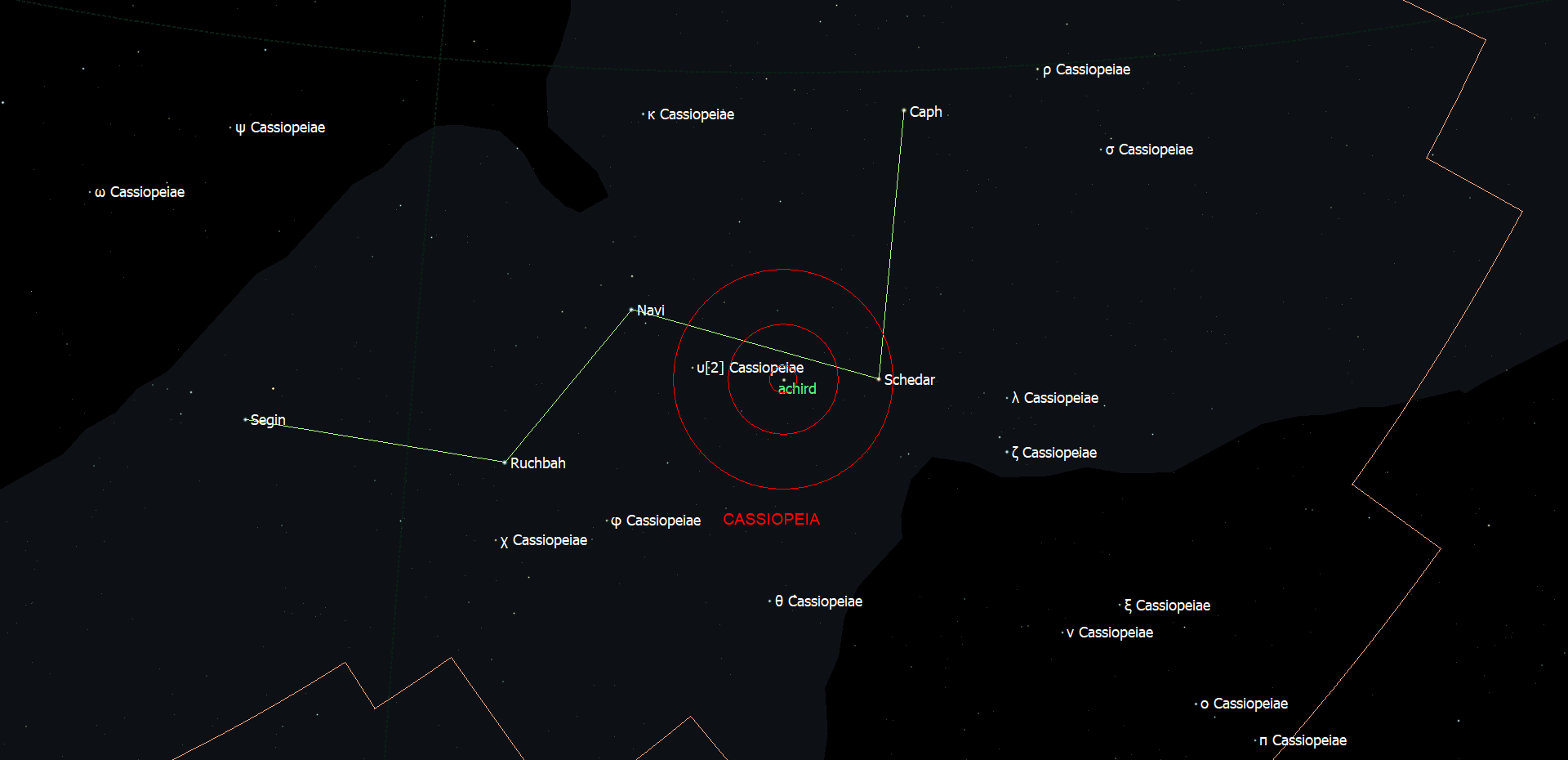 Schedar is de ster rechts beneden in de W en Achird is de helderste ster in het gebied tussen Schedar en gamma Cassiopeiae, de centrale ster in de W.